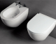 Set sanitari wc e bidet sospesi senza brida in ceramica con coprivaso sottile in termoindurente frizionato, colore bianco lucido