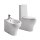 Set sanitari wc monoblocco e bidet a terra filomuro in ceramica con coprivaso avvolgente frizionato, colore bianco lucido