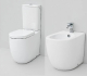 Set sanitari wc monoblocco e bidet a terra filomuro in ceramica con coprivaso sottile frizionato, colore bianco lucido