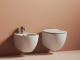 Set sanitari wc e bidet sospesi in ceramica con coprivaso avvolgente frizionato, colore bianco lucido.