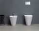 Set sanitari wc e bidet a terra filomuro senza brida in ceramica con coprivaso sottile frizionato, colore bianco lucido.