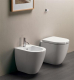 Set sanitari wc e bidet a terra filomuro in ceramica con coprivaso avvolgente in termoindurente frizionato, colore bianco lucido