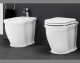 Set sanitari wc e bidet filomuro in ceramica con coprivaso in poliestere frizionato, colore bianco lucido.